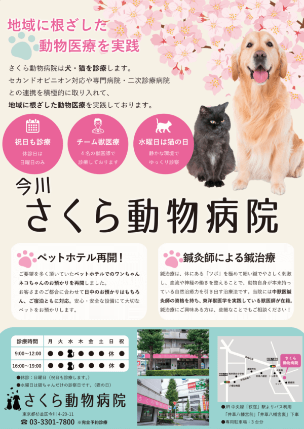 動物病院の店頭用紹介紙。病院リニューアルに伴い、低予算短納期で作成。ブランドイメージと強みを活かし、近隣病院との差別化を意識した設計。反響を受け、増刷済み。